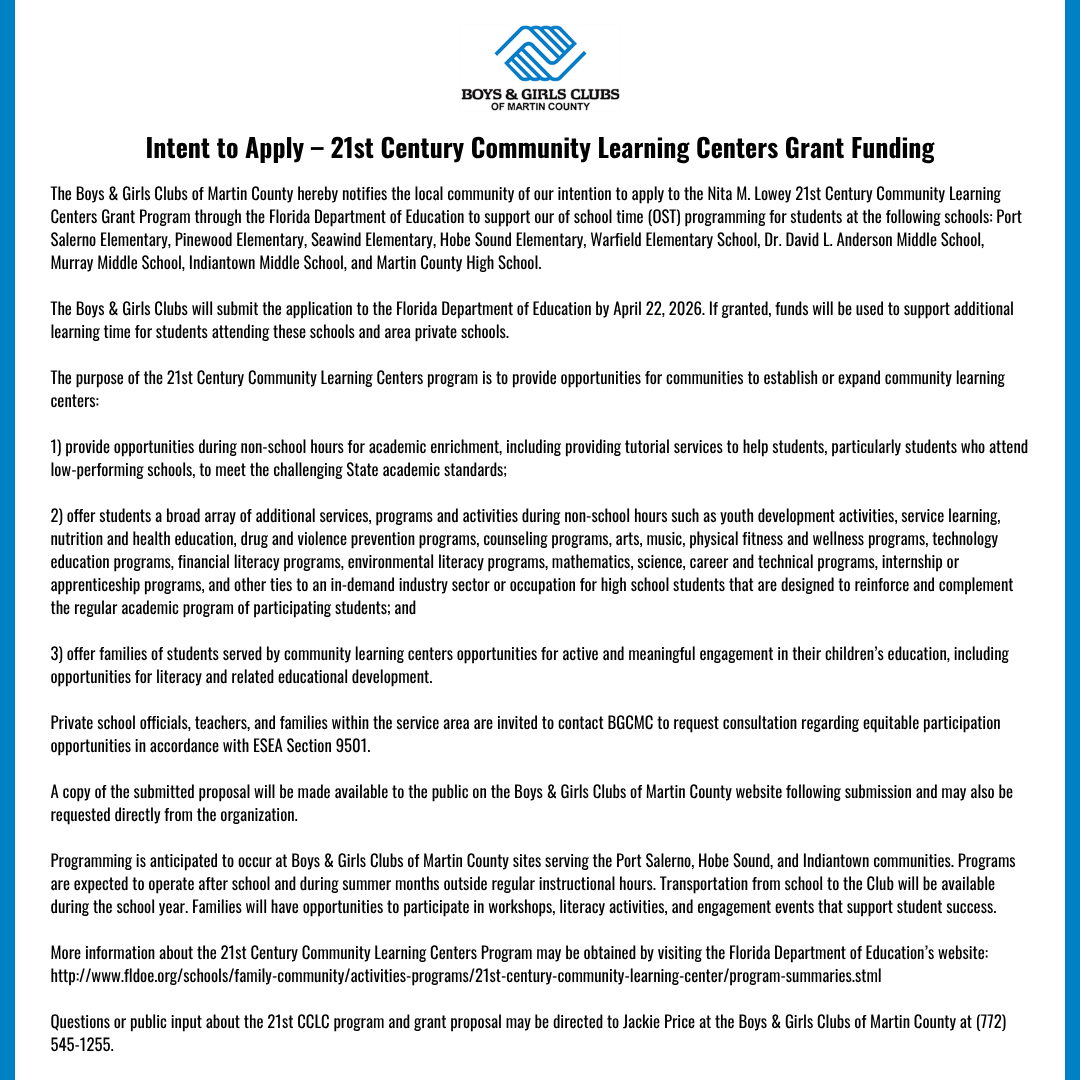 STUART—The door to opportunity will open even wider for local young people seeking to sharpen their employment skills thanks to a generous grant from Truist Foundation to the Boys & Girls Clubs of Martin County (BGCMC). BGMCM’s Workforce Development Programs—created in conjunction with business leaders and offering in-depth insights on a variety of in-demand trades, vocations and professions—received a $60,000 grant from Truist Foundation. Committed to creating economic mobility for all, Truist Foundation prioritizes strengthening small businesses and opening pathways to career opportunities. By focusing on job‑ready skills and real‑world career exposure, BGCMC aligns with Truist Foundation’s mission to build career pathways that equip individuals for middle‑skill jobs and upward economic movement. The Foundation focuses on helping workers navigate employment, access reskilling or upskilling opportunities, and secure sustainable, living‑wage jobs.Thanks to its support, the BGCMC will be better positioned to help young people · Strengthen their career readiness · Increase their access to job opportunities · Carve out sustainable pathways to their own economic mobility The grant funding will support BGCMC’s skilled trades training, career exploration, virtual training, culinary arts, drone piloting, and Manufacturing 4.0 coursework, which provides hands‑on learning experiences and the chance to earn credentials relevant to a prospective employer. The grant will also help more youth and young adults receive enhanced support to overcome barriers to employment, education, or professional growth. “On behalf of everyone at BGCMC—our staff, our Board, and most importantly, our youth—we are deeply grateful to Truist Foundation for believing in our mission and investing in our future,” says Keith “Fletch” Fletcher, President & CEO of BGCMC. “This grant will have a transformative impact on our workforce readiness offerings and help open doors to stable, meaningful careers for so many teens and young adults in our community.” Through this grant, BGCMC’s Workforce Development Programs directly support Truist Foundation’s goals by equipping local youth and young adults with the skills, training, and support needed to succeed in the workforce—creating real career pathways and potential for economic mobility in Martin County. “At Truist, our purpose is to inspire and build better lives and communities,” said Truist Treasure Coast Market President Steven Rivera. “That purpose comes to life through our partnership with Boys & Girls Clubs of Martin County to expand workforce readiness, helping teens and young adults gain job‑ready skills, industry‑recognized credentials and exposure to in‑demand careers. We’re proud to invest in programs that open pathways to stable, meaningful work and upward economic mobility.” About Boys & Girls Clubs of Martin County For more than 30 years, BGCMC has provided a safe, nurturing, and opportunity-rich environment for young people across Martin County. Through our Workforce Development Programs, we strive to ensure that every young person, regardless of background, has access to the training and resources needed to thrive. About Truist Foundation Truist Foundation is committed to Truist Financial Corporation's (NYSE: TFC) purpose to inspire and build better lives and communities. The Foundation, an endowed private foundation established in 2020 whose operating budget is independent of Truist Financial Corporation, makes strategic investments in a wide variety of nonprofit organizations centered around two focus areas: building career pathways to economic mobility and strengthening small businesses to ensure all communities have an equal opportunity to thrive. Embodying these focus areas are the Foundation’s leading initiatives – the Inspire Awards and Where It Starts. Learn more at Truist.com/Foundation.